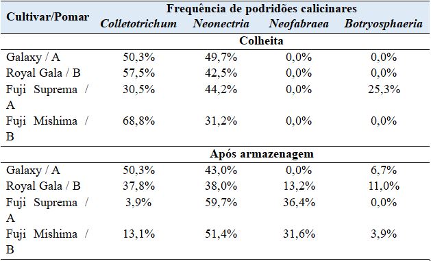 Na cultivar Gala, verificou-se somente a presença de Colletotrichum e Neonectrianas podridões calicinares na colheita em Vacaria(Tabela 1).Após armazenagem em câmara fria, foi observada a presença também de Neofabraea e Botryosphaeria. Já na cultivar Fuji, além de Colletotrichum e Neonectria, também foi observada a presença de Botryosphaeriana colheita. Na pós-colheita também foi observada a presença de Neofabraea e Botryosphaeria. Áreas com maior incidência de cancro europeu apresentam maior frequência de podridão calicinar por Neonectria. A‘Fuji’ apresentou maior frequência de podridão calicinar por Neofabraeado que a ‘Gala’. Após a armazenagem, enquanto que na ‘Gala’ predominou Colletotrichum e Neonectria, na ‘Fuji’ predominou Neonectria e Neofabraea.